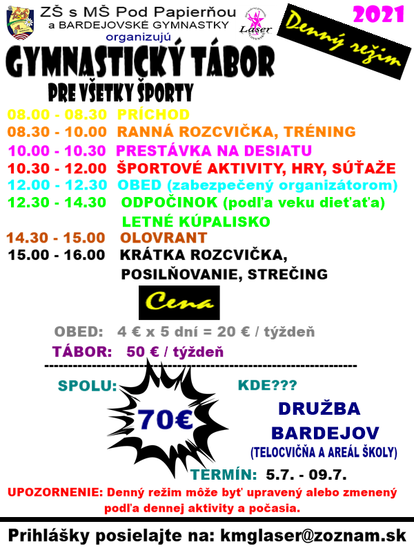 Ako by sme začali prázdniny, ak nie naším Gymnastickým táborom? Prihlášky prosím zasielajte alebo priamo odovzdajte trénerke do 30.6.2021
